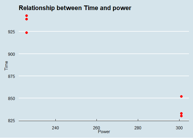Visually, we can see that there seems the be a linear connection between power and time, more power yields a lower time spend on the bike (hooray!).