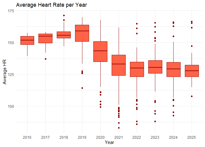 Average heart rate data tells a similar story, illustrated by trending towards a lower average heart rate since I started cycling more. After the drastic drop in average heart rate from 2019 to 2021, it stays quite constant, although I still observe the mean slightly decreasing every year, as does the variation.