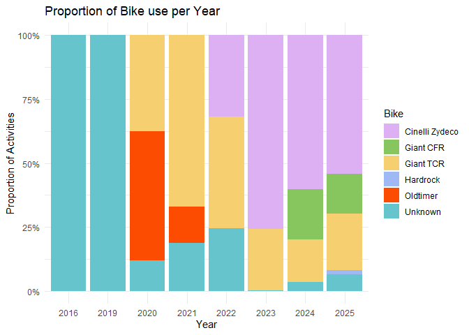 First, looking at the relative bike use each year, it is clear that the Cinelli quickly became my favorite bike to ride after I bought it in 2022. I still love my TCR as well, but the Cinelli’s versatility (pannier rack, mudguards, clearance for 40mm tires, disc brakes, …) make it super suited to use all year round and for commuting to work. The TCR on the other hand, is a pure race bike with carbon wheels, rim brakes and clearance for 25mm tires. So after buying the Cinelli, it quickly became the “good weather only” bike.