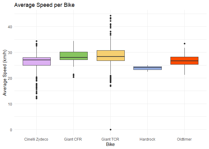 Looking at the average speed per year, we identify some logical patterns and can see that on average, I ride faster with my carbon race bike as compared to my alloy gravel bike (but not much tho!). High and low outliers for respectively the TCR and the Cinelli make sense: TCR is used for racing and I did a few bikepacking trips with the Cinelli.