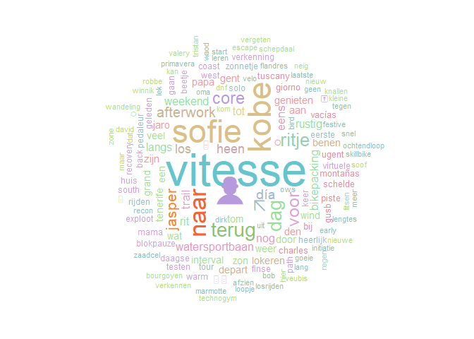 This wordcloud is by far one of my favorite visualizations of the Strava data. The biggest word, “Vitesse” is the name of my cycling club: Vitesse 9000. It’s also nice to see that the name of my girlfriend and the names of some of my best friends pop-up as big words, showing that cycling truly is a social hobby for me.