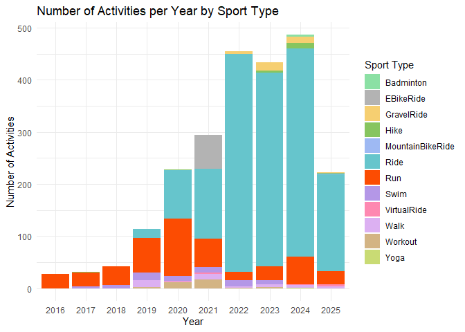 Let’s take a look at my yearly number of activities, bearing in mind that we are missing parts of 2016 and 2025: