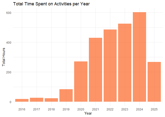Next, instead of number of activities, let’s take a look at the actual time spent. Here, it becomes clear that while my number of activities did not keep increasing, my time did.