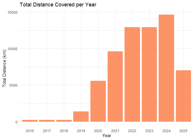 This sections browses through a few yearly totals and trends I observed in the activities.